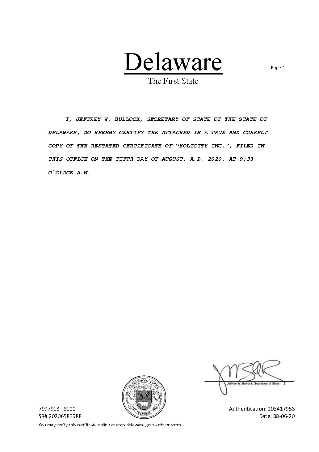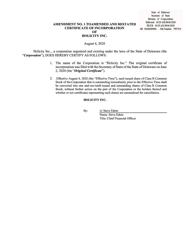 New York, NY - August 7, 2020 – Holicity Inc. (the “Company”) announced the closing today of its initial public offering of 27,500,000 units at a price of $10.00 per unit. The units are listed on the NASDAQ Stock Exchange (NASDAQ) and began trading under the ticker symbol “HOLUU” on August 5, 2020. Each unit consists of one Class A share and one-third of one redeemable warrant, with each whole warrant exercisable to purchase one Class A share at a price of $11.50 per share. Only whole warrants will be exercisable. Once the securities comprising the units begin separate trading, the Class A shares and warrants are expected to be listed on the NASDAQ under the symbols “HOL” and “HOLUW,” respectively.