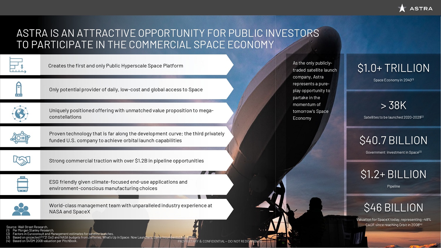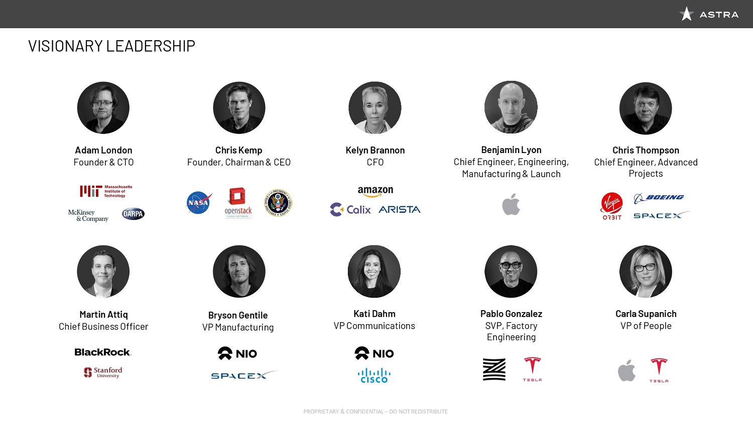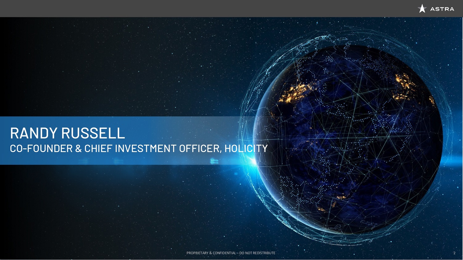 We are joined today by key members of the Astra Executive Team, including Founder and CEO, Chris Kemp, Founder and CTO, Dr. Adam London, our newest member, Chief Engineer, and EVP of Manufacturing, Production, and Launch, Benjamin Lyon, Chief Business Officer, Martin Attiq, and Chief Financial Officer Kelyn Brannon. Chris Kemp will go into more detail on his team a little later in the presentation, so I can stop there, though I do want to note that throughout the process, it has been incredible working with the Astra Executive Team, and we have been super impressed with the culture and talent of the whole Astra organization. Today you will get to hear from several of the company’s key leaders. I’m excited to share a bit more about the Astra story, and why we decided to pursue the business combination between Holicity and Astra, who we see as a critical enabler of this space economy.