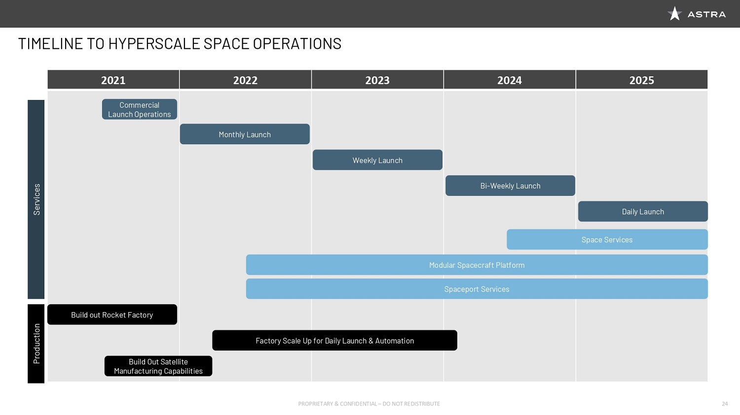 We plan to reach what we call “hyperscale” space operations in the next few years. Astra will commence our first commercial launch this summer, and we’ll begin to scale rapidly and expect to achieve the key milestone of daily launches by 2025.