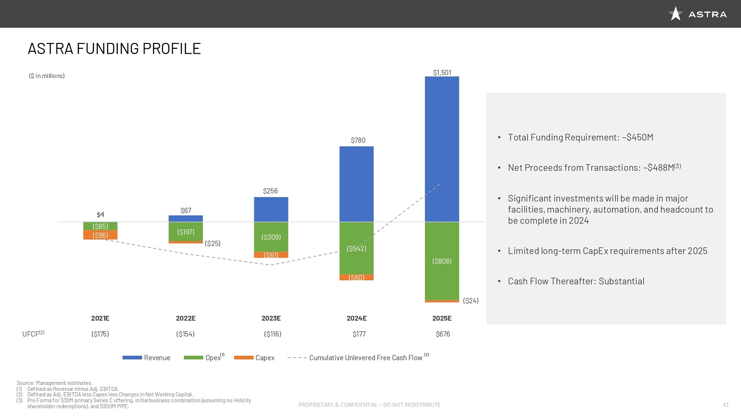 Our capital investments in facility upgrades, automation, and other equipment should be complete by 2024 and translate to material free cashflow in 2025 and thereafter. Assuming no Holicity shareholder redemptions, a $200 million PIPE, $30 million of new primary Series C proceeds results in approximately $488 million of cash to Astra’s balance sheet. We plan to efficiently deploy the proceeds from the Series C, the PIPE and the merger with Holicity to achieve our growth targets and meet the demands of our customers, which as Martin reviewed, currently is an excess of $150 million in contracted revenue with over 50 launches.