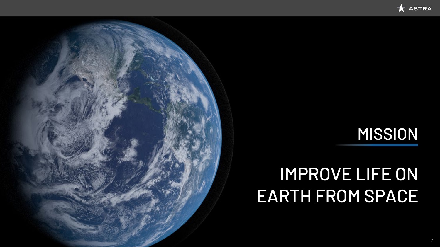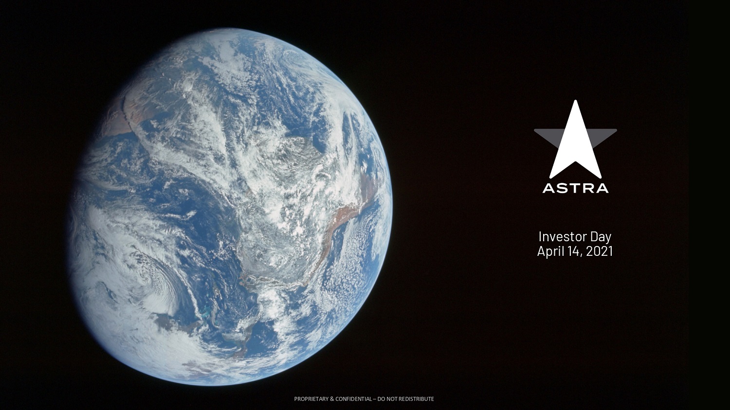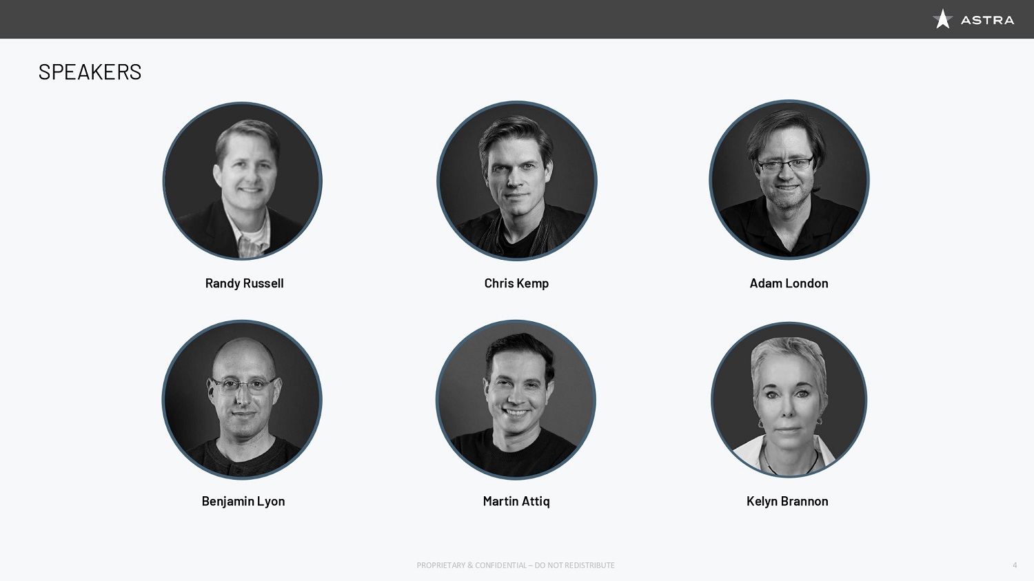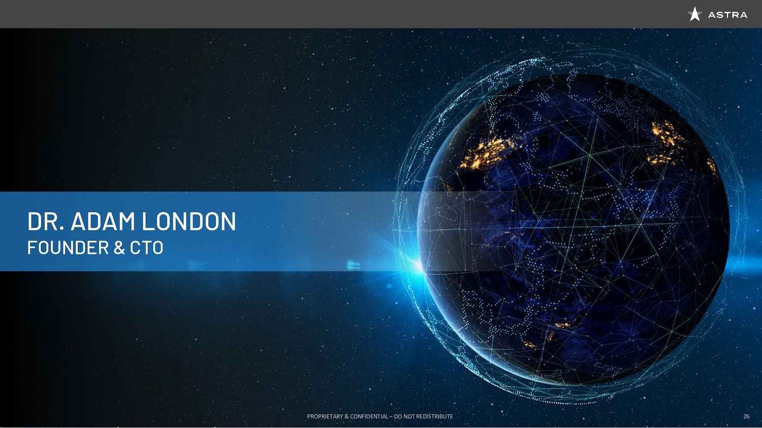 We are joined today by key members of the Astra Executive Team, including Founder and CEO, Chris Kemp, Founder and CTO, Dr. Adam London, our newest member, Chief Engineer, and EVP of Manufacturing, Production, and Launch, Benjamin Lyon, Chief Business Officer, Martin Attiq, and Chief Financial Officer Kelyn Brannon. Chris Kemp will go into more detail on his team a little later in the presentation, so I can stop there, though I do want to note that throughout the process, it has been incredible working with the Astra Executive Team, and we have been super impressed with the culture and talent of the whole Astra organization. Today you will get to hear from several of the company’s key leaders. I’m excited to share a bit more about the Astra story, and why we decided to pursue the business combination between Holicity and Astra, who we see as a critical enabler of this space economy.