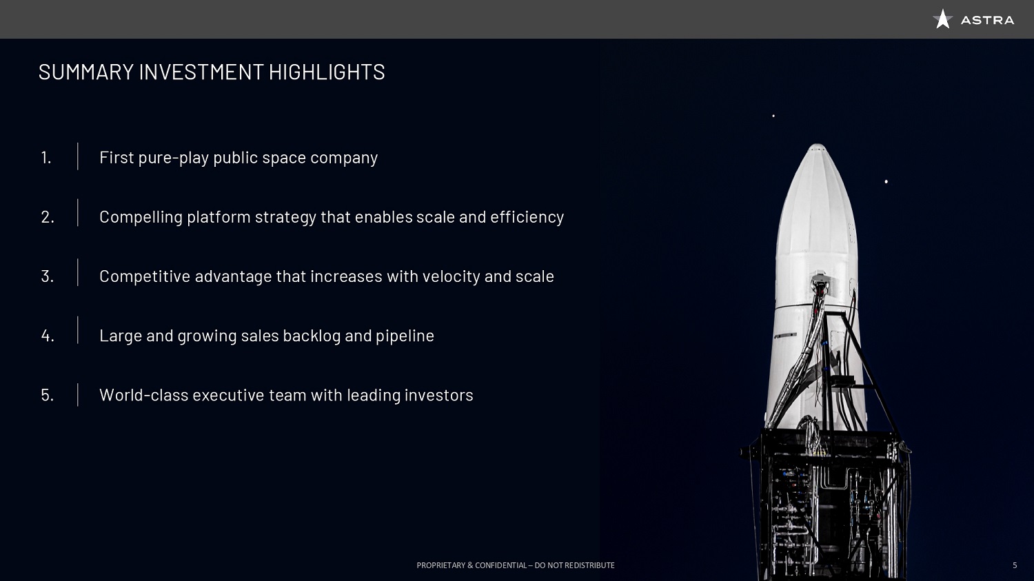 Our Holicity team worked through a comprehensive targeting process that considered over 100 potential transactions, and that ultimately led us to Astra. When Craig, our senior team, and I met with the founders, toured their incredible facility in Alameda, dug into the business model, and saw the standup of their most recently flown rocket, we knew immediately that Astra was a very special company. Early in the process, Craig raised an important insight: “How do we get Astra to go faster, and how much capital do they need to execute and fully scale?” We then worked with the company to carefully outline the plan that Astra will share today, which really underlined our initial business combination as the optimal path forward. We are convinced that the Holicity / Astra merger represents a singular opportunity to invest in a pioneering space services provider that we believe will scale to become a leading global platform. Our objective is that by the end of this Analyst Day, it will be clear that Astra will be a critical enabler of the trillion dollar-plus Space Economy. They have the team and facilities to rapidly scale operations, revenue and free cash flow, and they have proven technology, as evidenced by their successful December 15th launch, when Astra became the third privately funded US company to demonstrate orbital launch capability. And now, I’d like to hand it over to Chris Kemp, Astra’s CEO.
