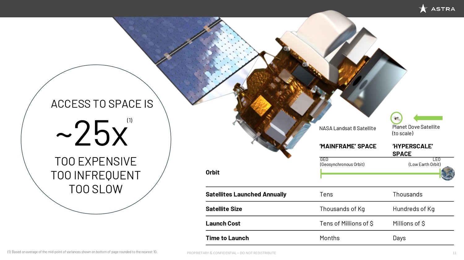These satellites are very different than satellites of the recent past. Unlike the large, multi-hundred million dollar satellites, like the one on the left and the NASA Landsat satellite, the satellites like the one on the right in the little green circle are many times smaller, many times cheaper, and they’re launched in many times greater numbers than the satellites on the left. And the reason why is because they’re much closer to Earth. If you look at the orbit that these satellites are in, the green bar shows how far away a geosynchronous orbit is from Earth, and a low Earth orbit. And that’s actually, you can literally stack the Earth to the left, and see how far away some of these large satellites have to be. And when they’re that far away, they have to be shielded from radiation, they have much more powerful and larger power hungry transmitters. They require larger solar panels. They require a lot of costs that just, frankly isn’t required if you’re in a lower earth orbit. Meaning that the satellite in the left costs hundreds of millions of dollars versus many, many fractions less. The satellites that are in the small satellite form factors typically costs between hundreds of thousands, or millions of dollars. So we’re really talking about a 25 time decrease in cost, frequency, and the time that it takes to get these on orbit.