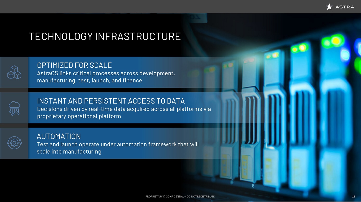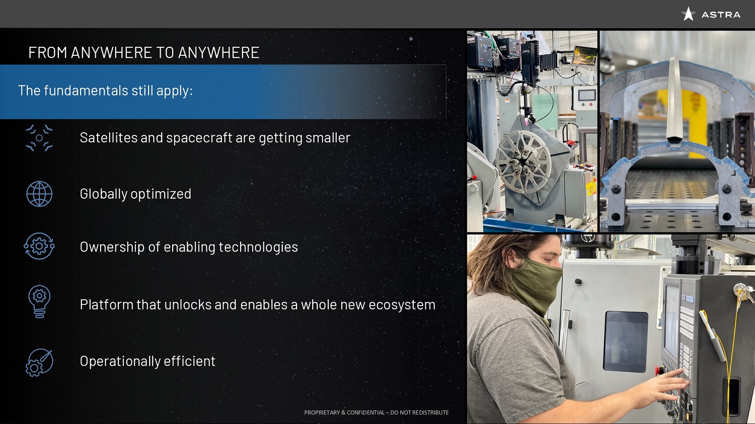 So Astra is thinking about this very differently. We’re not thinking about the old space industry, and the old launch industry, and the old satellite industry; we’re thinking about this like a platform. And that allows us to think very differently about how we build the entire company. So at its core, Astra is a technology company that has data at the very heart of how we make decisions and how we drive the business. So the technology infrastructure that we’ve built optimizes the business for scale, we built a platform called Astra OS that powers our factory, powers our financial systems, allows engineers to focus on making our products better in the ways that matter, the ways that drive value to our customers. And it allows us to have persistent access to data, whether it’s from our launch site or our spacecraft, or from our machines in our factory. This drives a level of automation that is unprecedented in our industry. So imagine being able to automate a rocket factory in much the same way you see automation in a car factory. Imagine automation at the launch site, driving the reduction or even elimination of people involved in the operation.