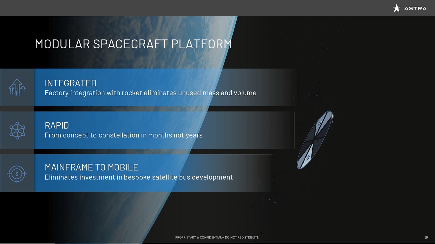 And you’re actually looking at the system in the image on the right. This system packs up into four shipping containers and a team of five people can move these containers via a C-130 Hercules Aircraft, via container ship, train, by truck. We unpack everything and launch the rocket in five days. And this is enabled by a high level of software integration and automation driving the operations of mission control. What this enables now is Astra to build a modular spacecraft platform that is unlike any other. Imagine the kinds of efficiencies that you get when you can put many satellites in one rocket. Imagine those satellites now being perfectly shaped to use all of the area inside the rocket. With a small rocket, it’s very important that we don’t waste any space on the way to space. So we want to have every bit of area, a solar panel, an antenna, a battery pack, some capability, we don’t want to waste any space.