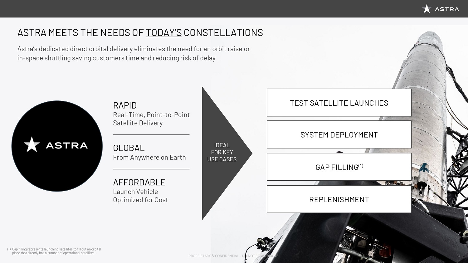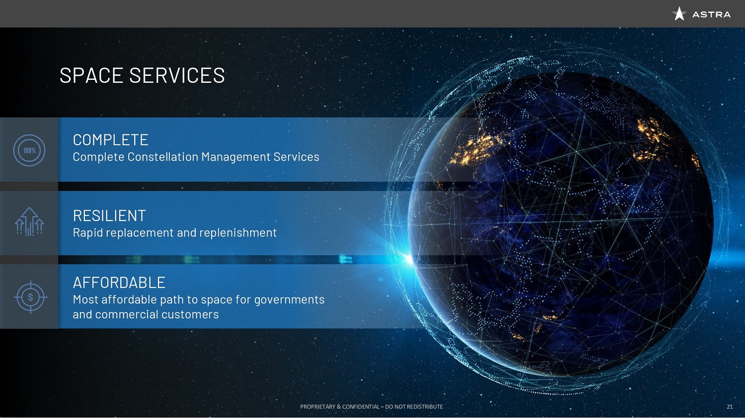 Because what drives cost in this industry is the cost of getting to space and the cost of making sure that you’re not flying half empty rockets to space, which is the reality of larger launch vehicles. Finally, this allows Astra to be in a unique position to deliver space services. Space services include constellation management services. So our customers just tell us where they need their assets and we worry about the rest. This allows a new level of resilient, rapid replacement, and replenishment capabilities without having to contract these in advance. Astra is managing the availability of space assets in much the same way that cloud providers manage the availability of compute instances and storage instances in the cloud. This allows us to offer a level of affordability and pace of deployment that, frankly, government and commercial customers begin to take for granted in the rest of computing, but not if that computing and not if that infrastructure needs to be in space. So we’re really just taking what everybody has taken for granted here on the ground and we’re expanding that into space.