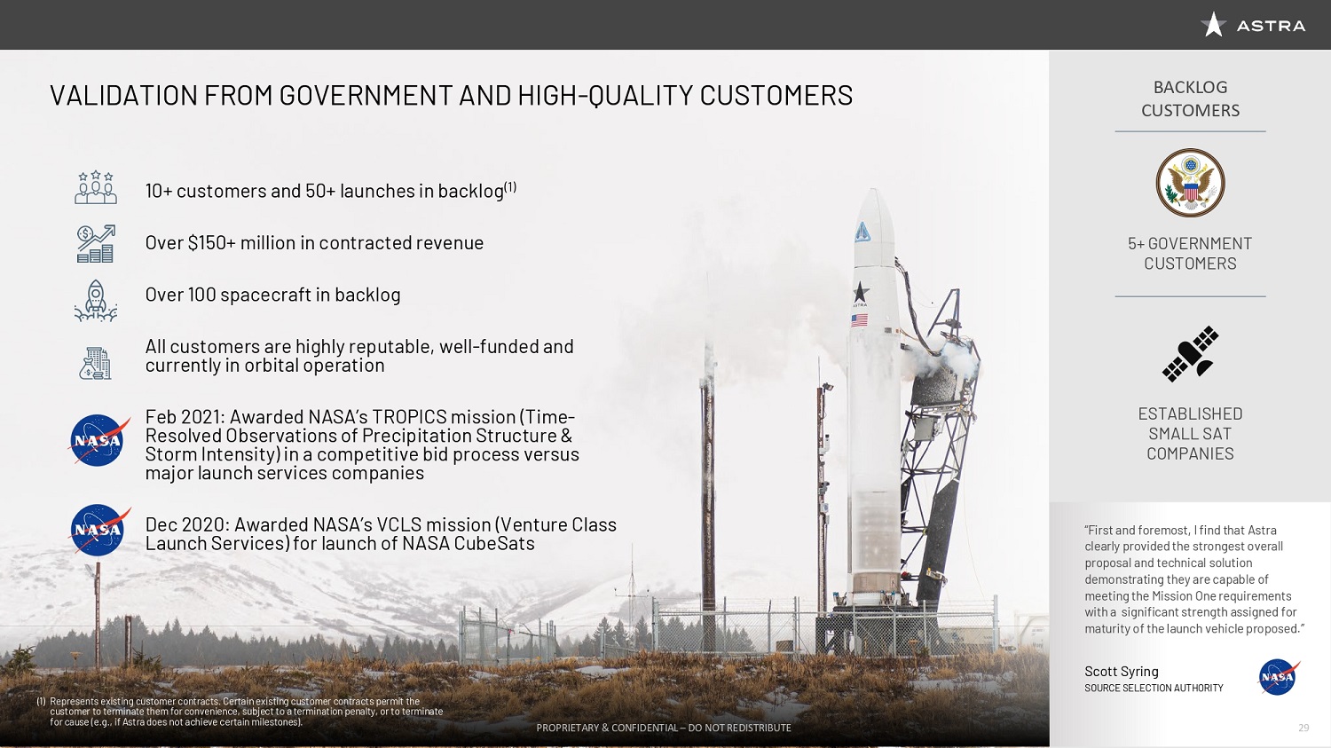 Thank you, Benjamin, and good morning, everyone. I’m Martin Attiq, Astra’s Chief Business Officer. Today I’ll walk you through the overall market opportunity, including our existing customer base and our pipeline. We built this company to enable the space economy, and since the beginning, we’ve been talking to customers. We’ve deeply understood their businesses and their pain points. Our customers are attempting to solve some of the world’s hardest problems, including climate change, by monitoring methane emissions or ocean movements. We’re trying to connect every human on earth with high-speed Internet, and we’re trying to connect every device on the planet from your phone to an autonomous vehicle. Their pain points are actually quite simple, being able to get to space quickly, as affordably and reliably as possible. And that’s the foundation by which we have built our products and services for our customers. Our customers have not just been alongside us in this journey. They’ve also awarded us with contracts. We have more than 10 customers that represent more than 50 launches in our backlog. That represents over $150 million of contracted revenue. We have a mix of both government and commercial customers. Our commercial customers are all highly reputable, they’re well-funded, and they’re currently in orbital operations. So we’re confident they’ll be ready when we’re ready. The government has taken notice as well. We’ve recently been awarded two NASA contracts, one in December, which is the NASA VCLS contract mission, and one in February, where NASA awarded us a constellation mission of three different launches. What’s been great about that is that the government has validated our approach, and NASA has said in their source selection document that Astra represents the best value to taxpayers by delivering satellites into the right place in space as affordably as possible, the exact reason why we built the system we had built.