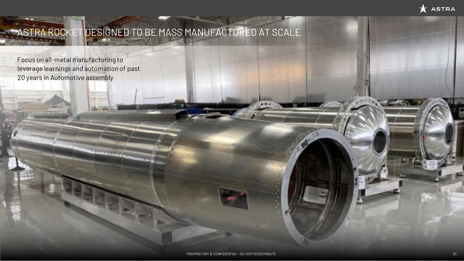 A quick overview of what we’ve accomplished so far. Our focus is always on maximizing our rate of learning, and I’m proud to say that it’s worked. After founding the company in late 2016, we had our Rocket 1.0 built and into test by the end of 2017. We conducted its test flight in mid-2018, followed by a test flight of Rocket 2.0 with improvements at the end of 2018. Learning from our customers and their feedback though, we decided we needed to double the size of the rocket to increase its ultimate payload capability. And so we redesigned the entire rocket and the launcher based on what we’d learned from Rocket 1.0 and Rocket 2.0. Then we had Rocket 3.0 ready for the DARPA launch challenge in early 2020. We learned a lot of things from that campaign that led to a few improvements in the rocket and the launcher, and conducted the flights of Rockets 3.1 and 3.2 towards the end of 2020, culminating in 3.2 demonstrating orbital capability. So that was about four years from the start of the company and about two years from when we decided to resize the rocket. And we think this is showing the strategy is working. We’ve achieved this demonstration of orbital capability faster than any other company, three years faster than SpaceX, almost three times faster than Rocket Lab and Virgin Orbit from the start of the companies. Why is this possible? Fundamentally, it’s because we’ve designed our rockets to be manufactured at scale. We’re optimizing for manufacturability and building a lot of rockets and launching a lot of rockets, not precisely for per rocket performance. And so we’re taking a lot of lessons learned from the automotive and other manufacturing industries of the past 20 years. Particularly, as cars have shifted from being almost all steel to more and more aluminum, we can leverage a lot of the learnings because our rocket is, frankly, about the same size diameter, etc., so roughly the same size as cars, there’s a lot of things that we can leverage there.