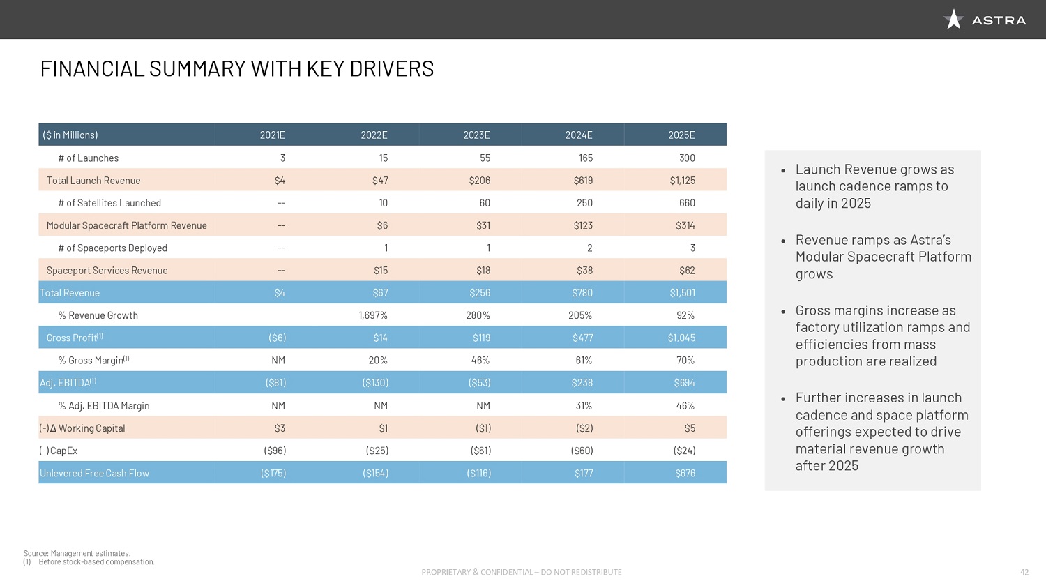We believe that Astra’s plan to offer end-to-end constellation services, including satellite design and assembly and launch, and offer spaceport services will, at scale, deliver a compelling mix of margins that aggregate to 70% gross margin and 50% EBITDA margin on an adjusted basis. We also expect strong free cash flow conversion.