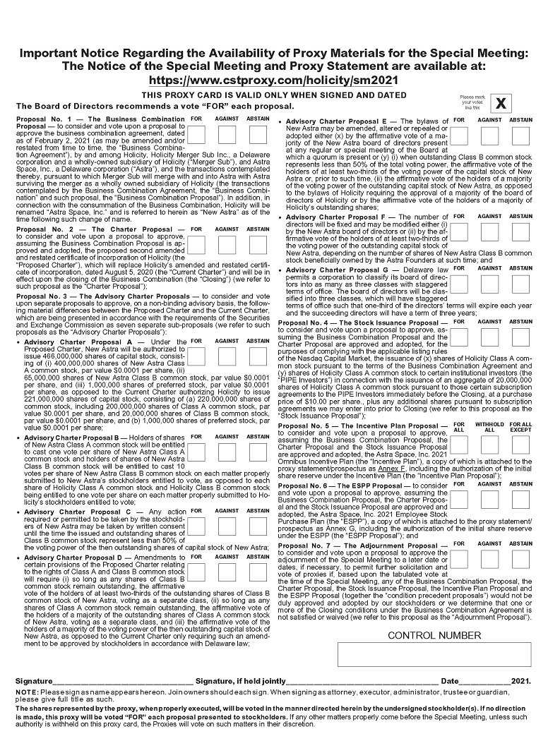 (8) Represents shares of New Astra Class A common stock to be issued upon the exercise of (i) 9,999,976 warrants to purchase New Astra Class A common stock underlying units issued in Holicity’s initial public offering (“public warrants”) and (ii) 5,333,333 warrants to purchase shares of Holicity Class A common stock underlying units issued in a private placement simultaneously with the closing of Holicity’s initial public offering (“private placement warrants” and, together with the public warrants, the “Holicity warrants”). The Holicity warrants will convert into warrants to acquire shares of New Astra Class A common stock.